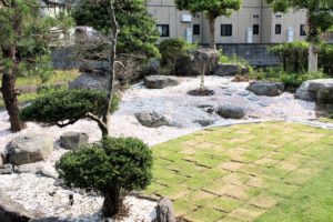 当初は奥に入ることもできませんでしたが、草を刈り枝を間引きを続け、ようやく手を加えれる状態になったので、和風の外観に合わせて砂利を撒き芝生を植え、日本庭園のように整えました。