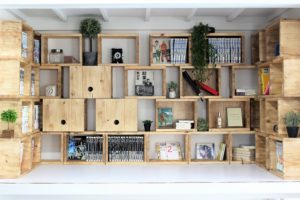 ホームセンターの木材を組み立て、本棚を設置し休憩スペースとして活用。